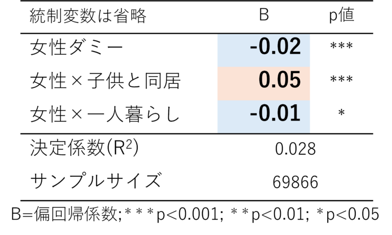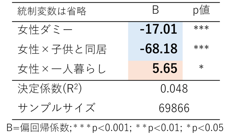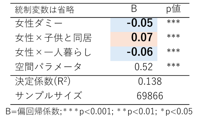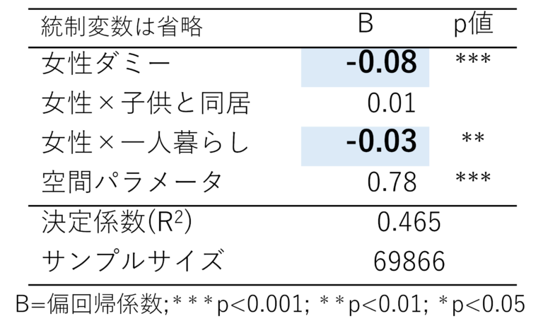 - 男性と女性では女性の方が移動時間・移動距離共に、短い傾向があることが明らかになった。一方で、女性は子供と同居していることで移動時間が長くなることが明らかになった。(表7,8)