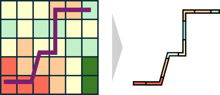 切断した各ラインに、道路幅員や土地利用の情報を付与した。(図3) - 経路全体に占める都市的要素の割合の計算