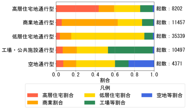 切断する前の経路全体の長さに占める道路幅員や土地利用の割合を計算した。 - 都市的要素によるラストワンマイルの類型化
