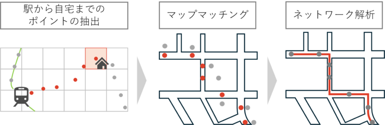 すべてのGPS測位点から、駅を起点とし自宅が終点となっている一連のポイントを抽出した。 - マップマッチング