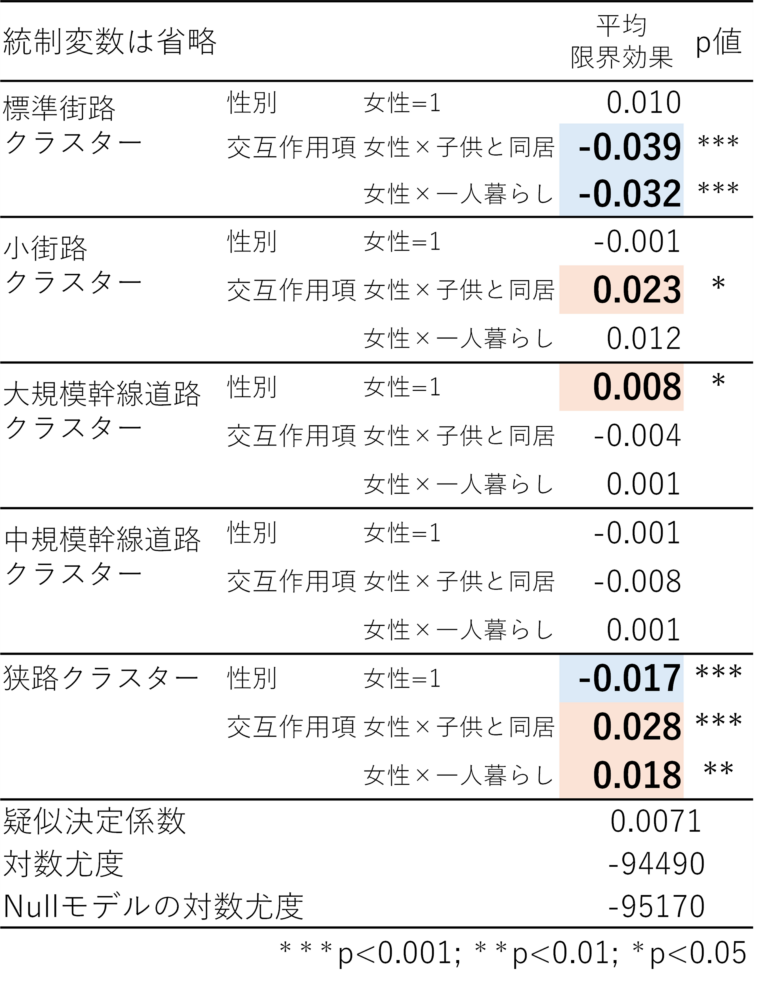 - 道路幅員クラスターを従属変数とした多項ロジスティック回帰分析から、女性はラストワンマイルにおいて幅員の広い道路を通行し、幅員の狭い道路を通行していない傾向があることが明らかになった。一方で、女性は子供と同居していることで、狭路クラスターに分類される確率が高くなるという結果も得られた。(表10)