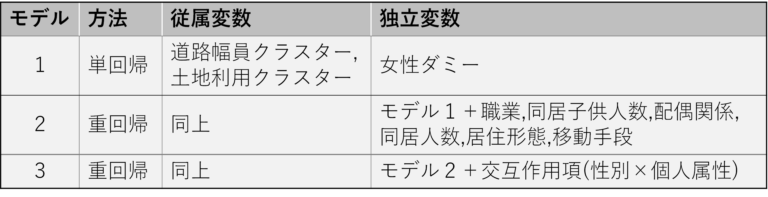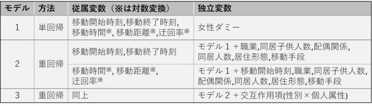 - 抽出したラストワンマイルについて5つの移動特性(移動開始時刻・移動終了時刻・移動時間・移動距離・迂回率)における男女差について明らかにするため階層的重回帰分析を行った。(表3)