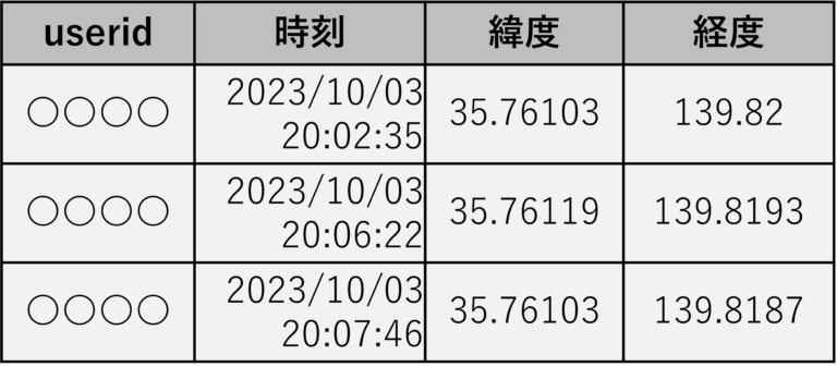 - useridによって個人の移動を追跡することが可能となっている。(表1)