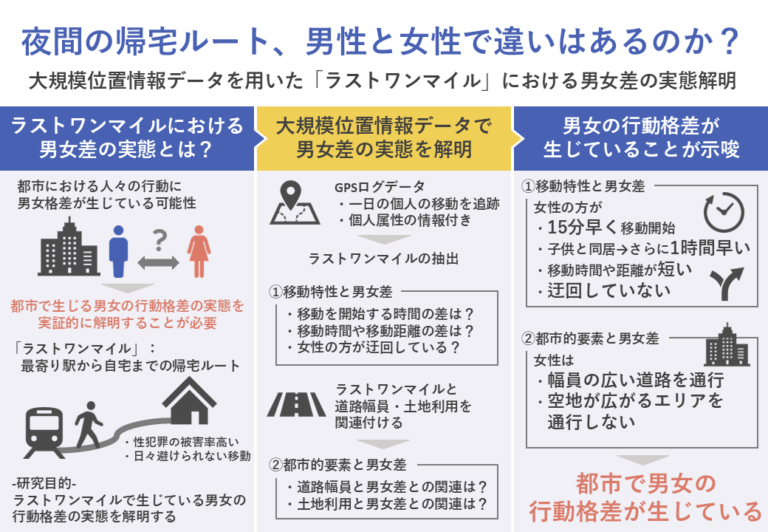 - 本研究では、GPSログデータを用いて夜間帰宅時のラストワンマイルにおける男女差の実態解明を行った。その結果、都市における実際の行動場面において、男女の行動に格差が生じていることが明らかになった。