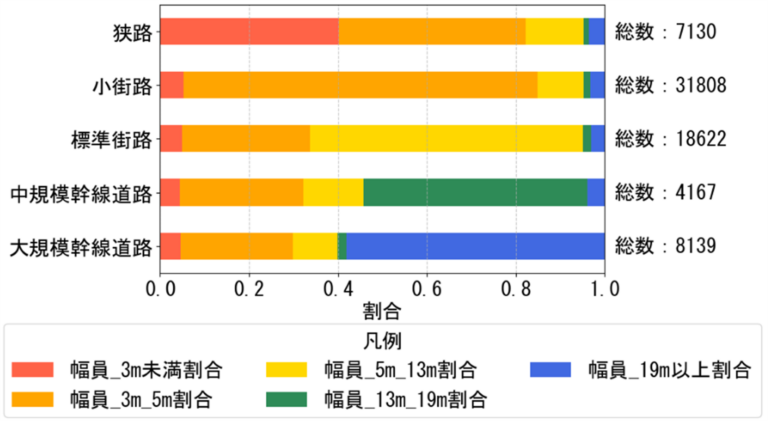 - 道路幅員のデータは、国土交通省国土地理院の数値地図(国土基本情報)3)から入手した道路中心線データ(2024)に記載されているものを利用する。