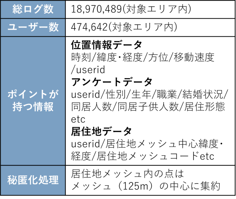 - データにはポイントの位置情報(緯度・経度等)のみならず、アプリ内のアンケートより収集した個人属性や、居住地や勤務地の大まかな位置が含まれている。(表2)