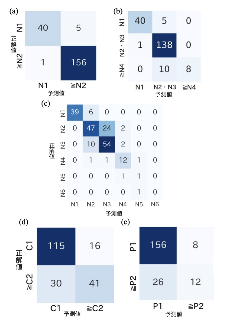 混同行列を見ると、最良のモデルはP1陰性クラスで164ケース中156ケース(95.1%)という高い検出率を示しましたが、P2以上の陽性クラスでは38ケース中12ケース(31.6%)しか正しく分類されず、クラス間で大きな性能差が見られました。