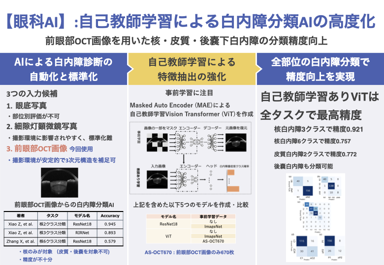 本研究では、前眼部光干渉断層撮影(AS-OCT)画像から白内障の重症度を高精度に分類するための人工知能(AI)システムを開発しました。特に、Vision Transformer(ViT)と自己教師学習を組み合わせることで、従来の手法より優れた分類精度を実現しました。当アプローチは核白内障の6段階分類だけでなく、これまで実現できていなかった皮質白内障・後嚢下白内障も含めた包括的な分類システムを構築することに成功しています。ラベルなしデータを活用した医用画像特有の特徴抽出技術により、限られたラベル付きデータからも高い分類精度を達成した点が本研究の革新的な側面です。