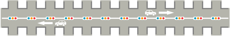 - Newell[4]は、3交差点以上で構成される路線では、路線全体の遅れに影響を与える交差点と、そうでない交差点が混在することを述べている。
