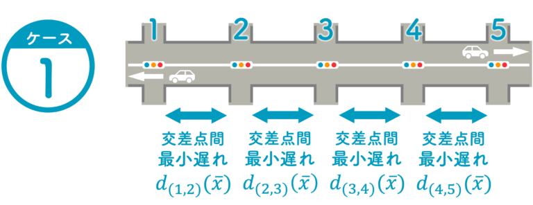 - 一見すると、図4(ケース1)のように全ての隣り合う交差点間に2交差点の理論式を独立に適用し、それぞれの最小遅れの総和を取れば、路線全体の最小遅れをうまく推定できそうである。