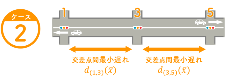 - 一方、交差点1-3, 3-5が系統効果が低い距離だとすると、その間の交差点を無視した図5(ケース2)のような状況を考え、この交差点間に2交差点の理論式を適用し、それを足し合わせたものは、最小遅れの近似として妥当であると言える。