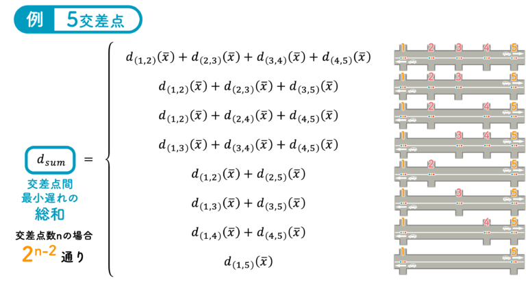 - したがって、全ての組み合わせに対して遅れを網羅的に計算し、その中から最大のものを選ぼう(全探索)とすると、交差点数nによって指数関数的に増加していくことに留意する必要がある(指数関数アルゴリズム)。