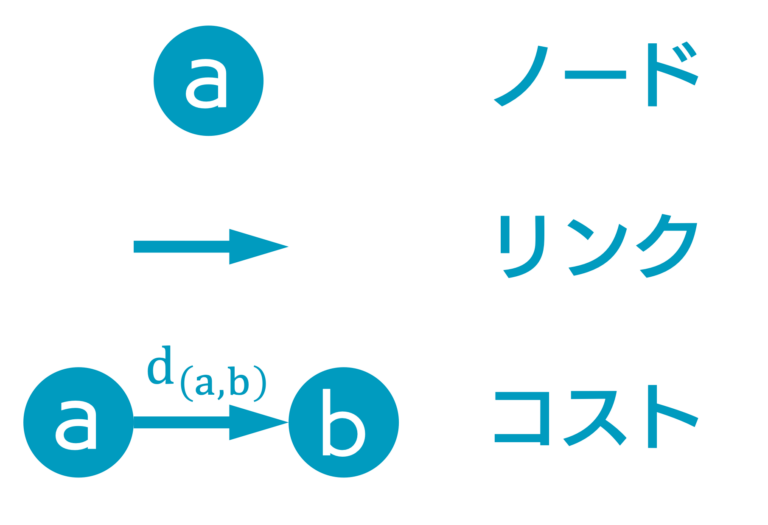 - まず、前節で説明した問題をネットワークとして表現することを試みる。そこで、図7のように、交差点1, 2, … , nをノード、各交差点同士の組み合わせをリンク、交差点間最小遅れd(a,b)(x̅)をコストとみなす。