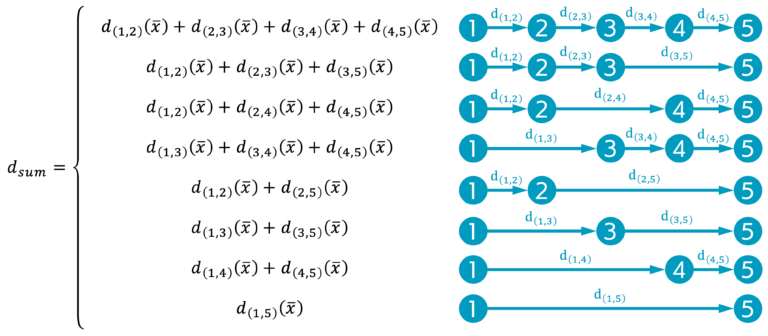 - このとき、総和dsumは、単一基点である交差点1から、単一終点である交差点nに向かうリンクのコストをそれぞれ足し合わせることによって求められる。例として5交差点の場合の、dsumの数式表現とネットワーク表現の対応を、図8に示す。