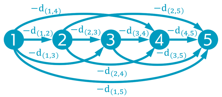 - したがってこの最短経路問題は、動的計画法のアルゴリズムを用いて極めて効率的に解くことができる。計算量オーダーはO(n2)となる。