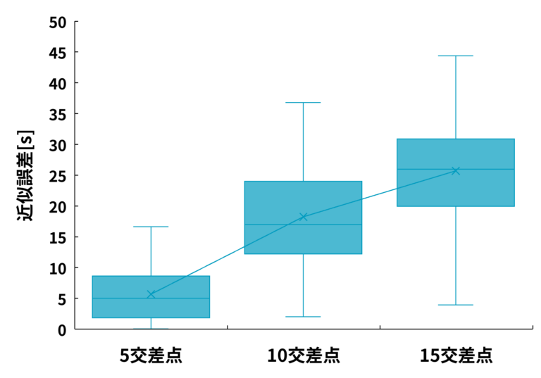 - 近似誤差の分布を図14に示す。近似誤差の平均は5.67[s](5交差点),18.24[s](10交差点),25.71[s](15交差点)に、中央値は4.99[s](5交差点),17.00[s](10交差点),25.95[s](15交差点)となった。