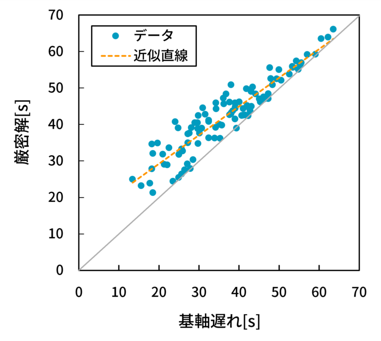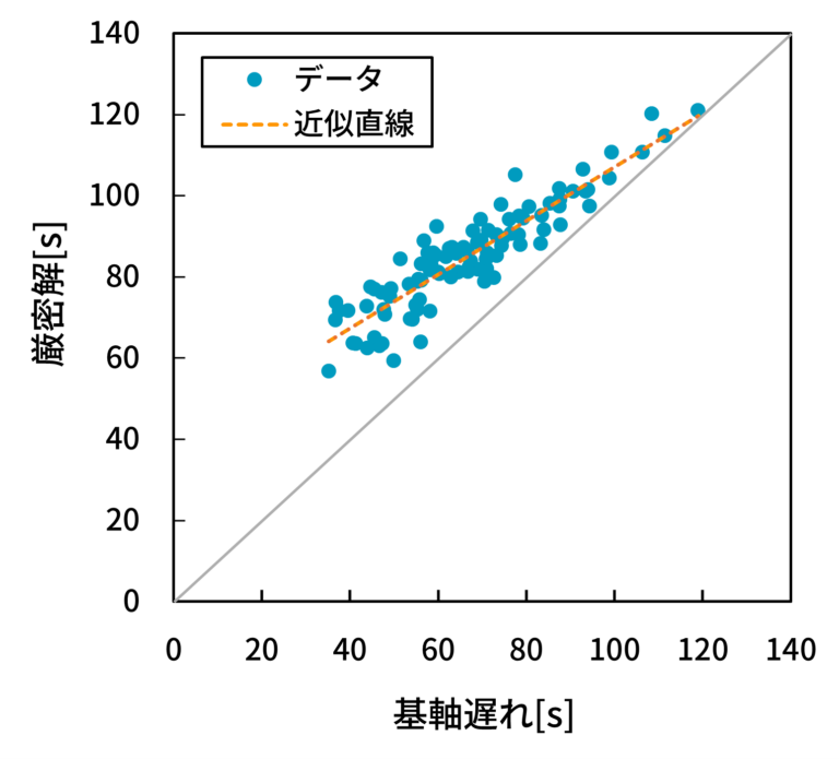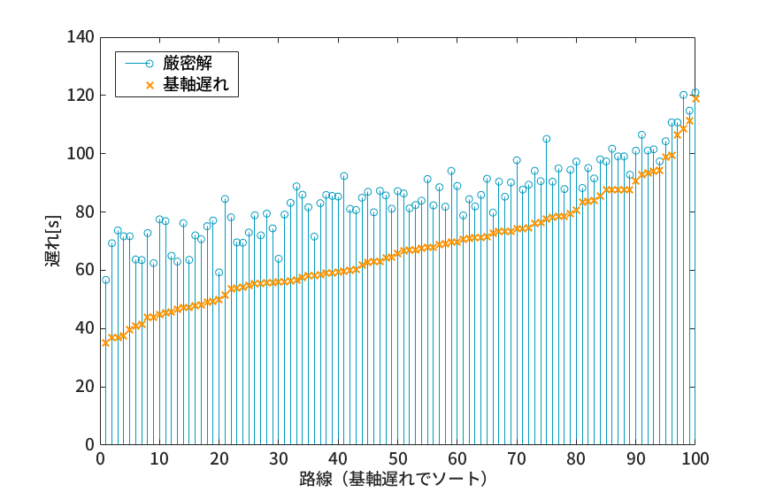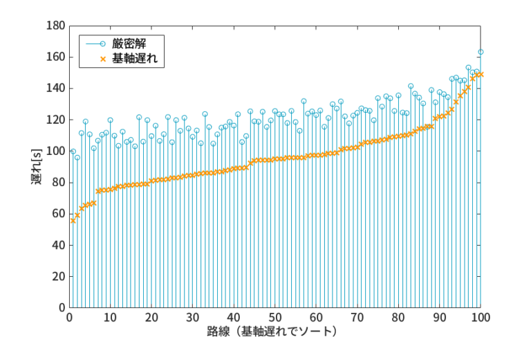 - 図11, 図12, 図13から、全300路線のうち298路線において基軸遅れが厳密解を下回ることが分かる。このことから、榊原・大口による検証とほとんど一致する結果が得られた。