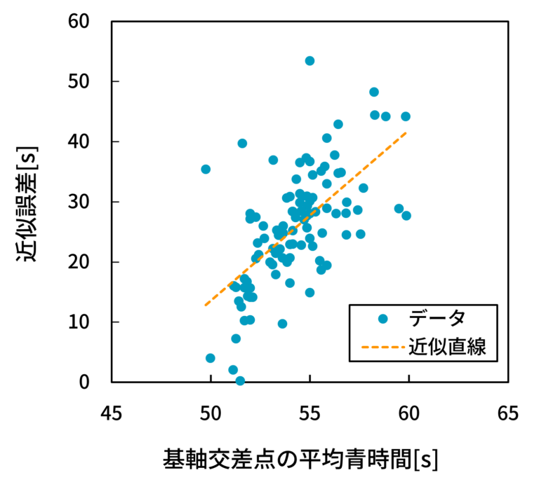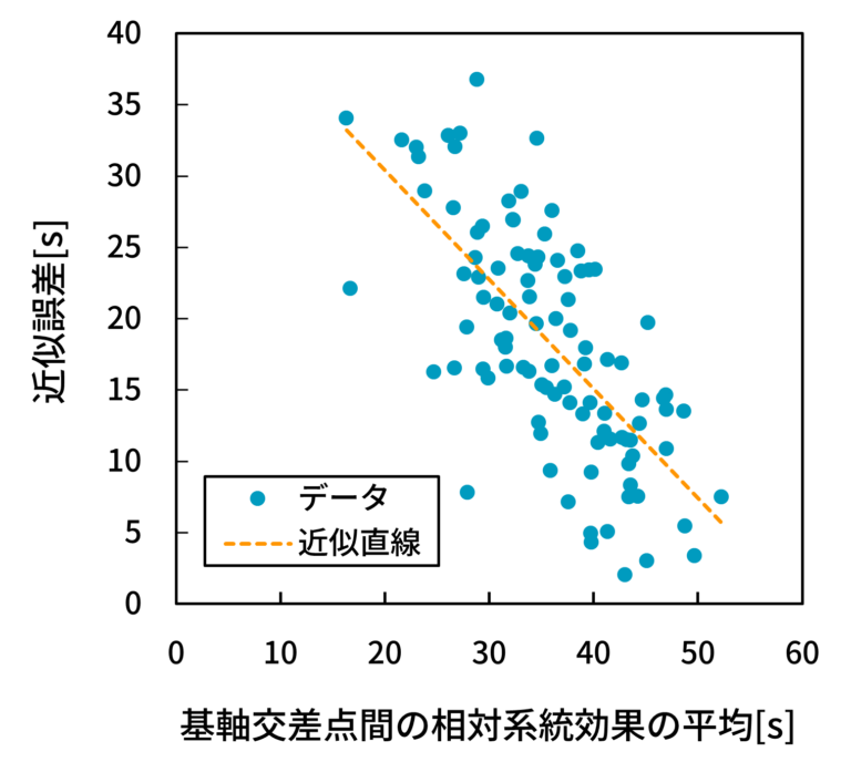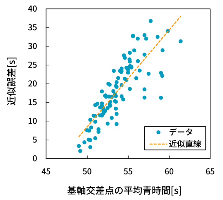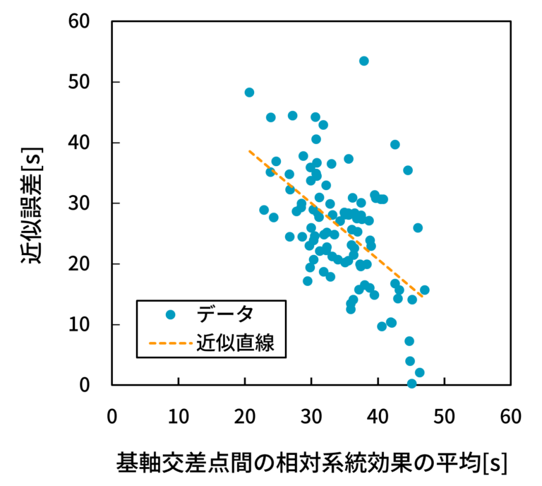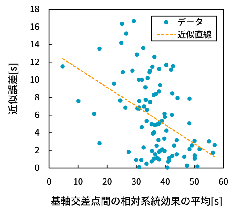 - 基軸交差点の青時間が小さく、かつ系統効果の悪い距離関係にあるほど、誤差が小さい(i.e., 基軸遅れの精度が高い)関係にある。より簡単には、基軸交差点の青時間が小さいほど、誤差が小さい関係にある。