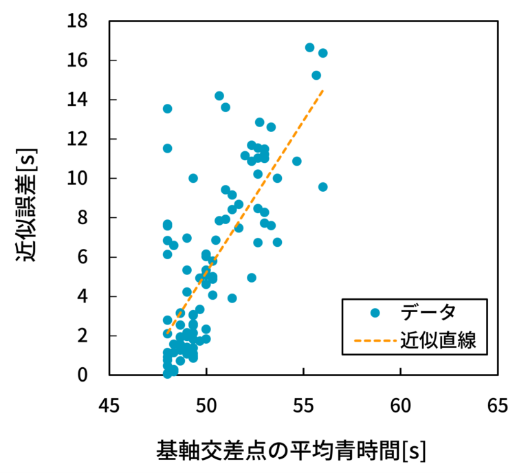 - 図21, 22, 23から、基軸交差点間の平均青時間と近似誤差の間に正の相関(相関係数 0.7360, 0.8238, 0.6185)が見られることが分かる。これは、基軸交差点の平均青時間が小さいケースでは近似誤差が小さくなり、反対に平均青時間が大きいケースでは近似誤差が大きくなることを意味する。この結果から、先ほどと同様、前者のケースでは基軸交差点にて生じる遅れのみで路線全体の遅れをほぼ見積もることができていること、反対に、後者のケースでは基軸交差点にて生じる遅れと最小遅れとの間に乖離があることが言える。