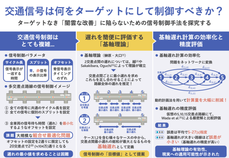 - 次に、都市部街路を模擬した5, 10, 15交差点の計300路線を対象に、基軸理論とWada et al.に基づく厳密解法との比較分析を行い、基軸遅れの精度と、それを与える路線条件について考察した。その結果、以下のことが明らかになった。
